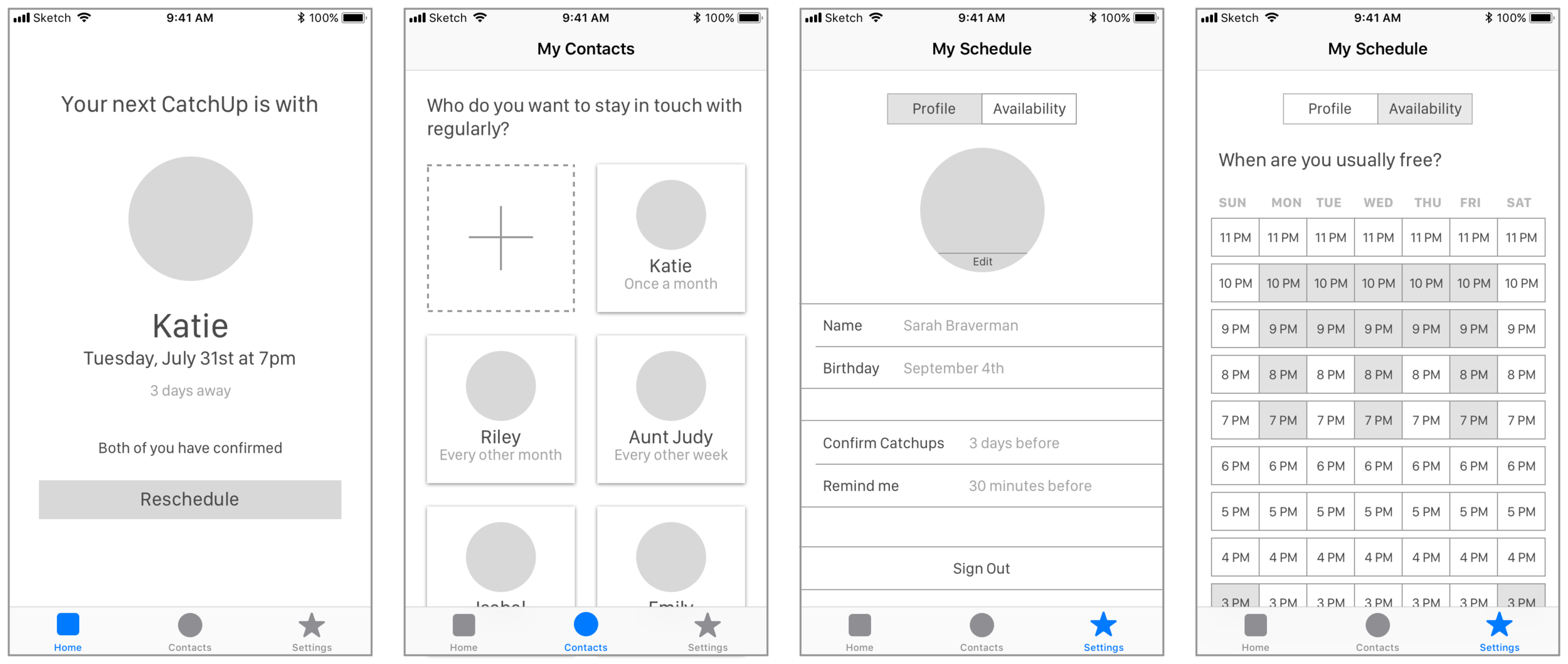 Personal interviews provided a more human dimension of information. When we first explored the design space of staying in touch, we thought periodic reminders would be the answer. However, personal interviews taught us that scheduling is actually the biggest pain point. Users struggled with the back and forth involved in finding a mutually agreeable time. This insight changed the direction of our app completely.